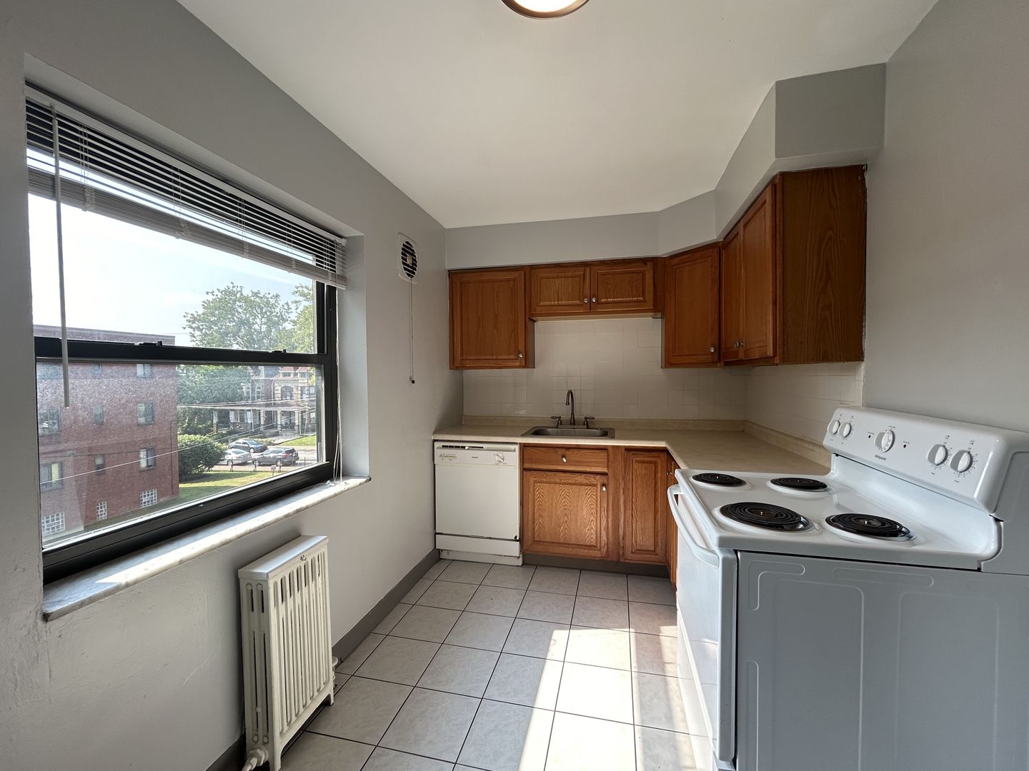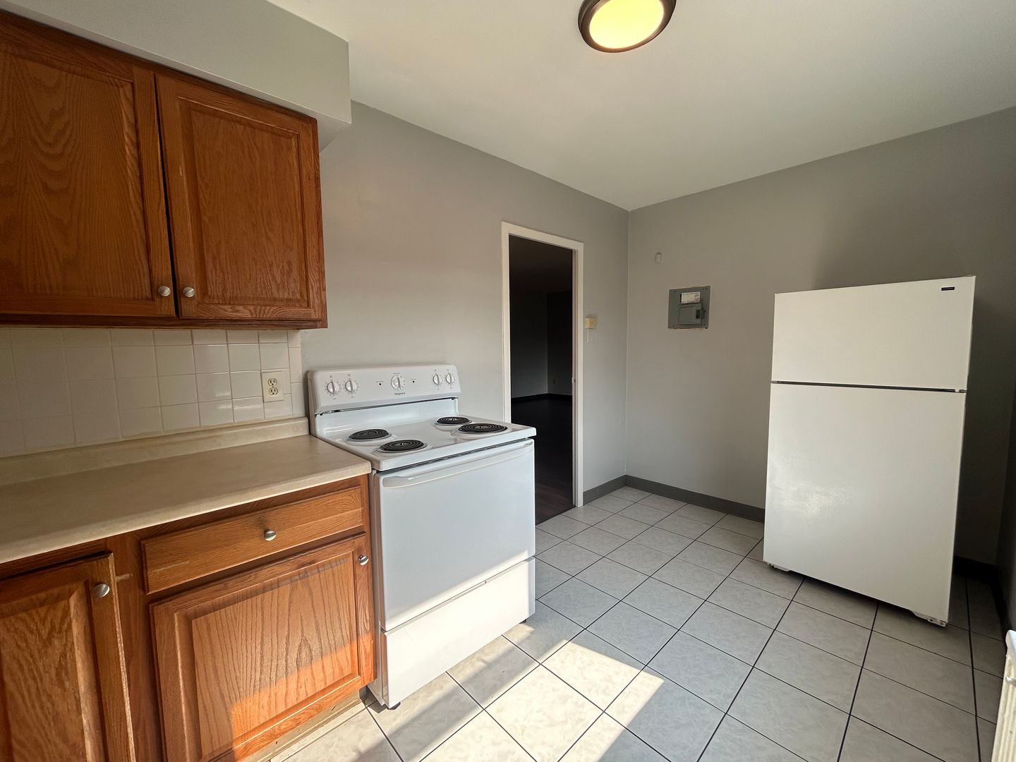 - Equipped kitchen with fridge, electric range, and dishwasher